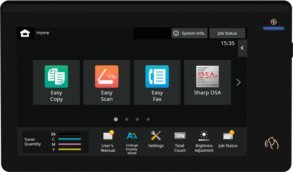 Die Drucker der BP-Serie präsentieren sich in einem modernen Titan-Design und verfügen über einen neigbaren 25,7 cm großen LCD-Touchscreen mit klaren Symbolen, der eine Bedienung ähnlich der eines Smartphones erlaubt. Zusätzlich zeigen farbige LED-Leuchten auf einen Blick den aktuellen Gerätestatus an, was die Nutzung besonders benutzerfreundlich gestaltet.